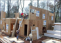 Not really. This is a photo of a house being built with giant styrofoam/particle board ice cream sandwiches. They're called Structurally Insulated Panels. They are built at a factory to measure and then assemled on site -- no need for traditional framing. We're looking into this because we've heard that they can save on construction time/cost, as well as being very energy efficient.